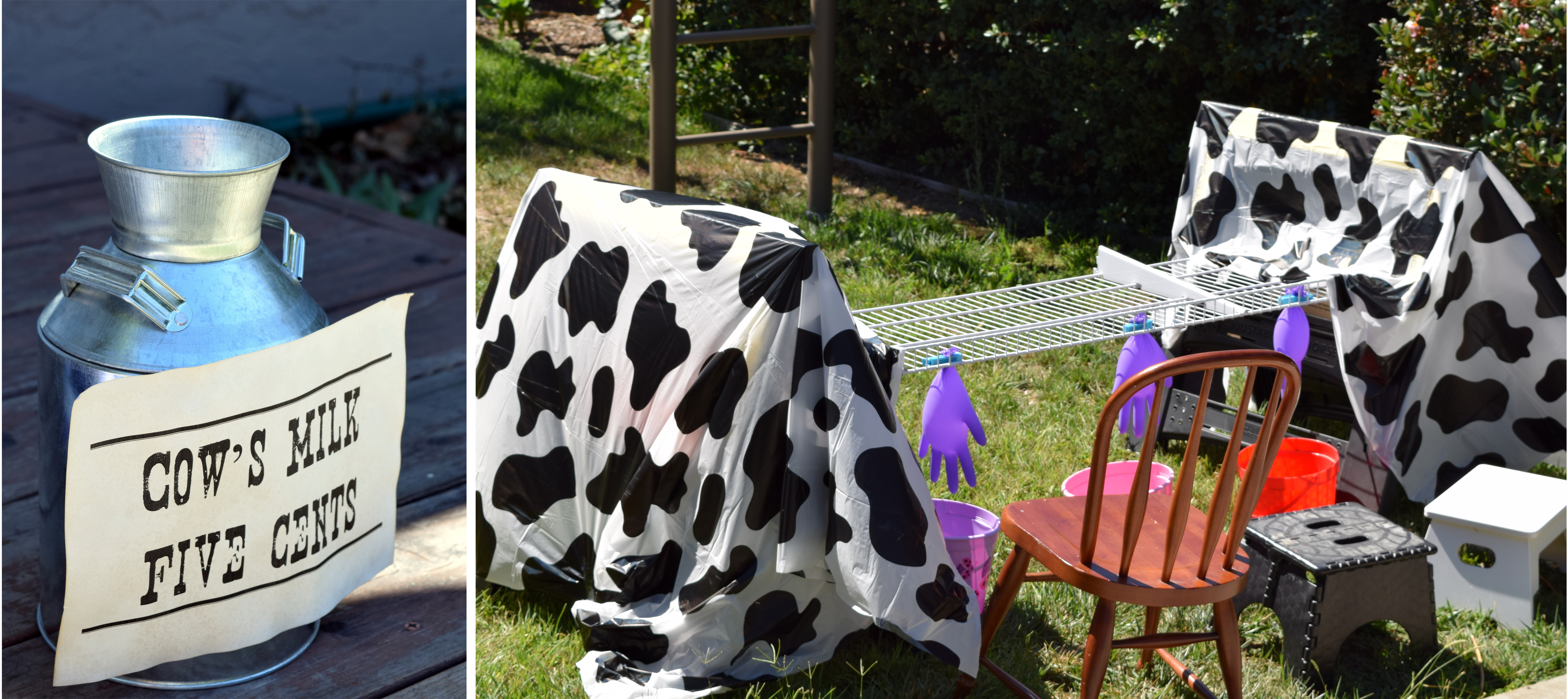 My husband set up the cow milking station with saw horses and a wire shelf that was sitting in our garage. We covered the saw horses with cow print table covers to make it more cow-like. We filled disposable gloves with water, clipped them closed, pierced the glove’s fingers with pin holes and hung them from the cow milking station. We put a bucket underneath each glove and a stool before it. We told the kids to milk their cow and then to pour their “milk” into our milk can. Once they were done milking regardless of the quantity, we had them write “cow’s milk” and “5” cents on their ledger.