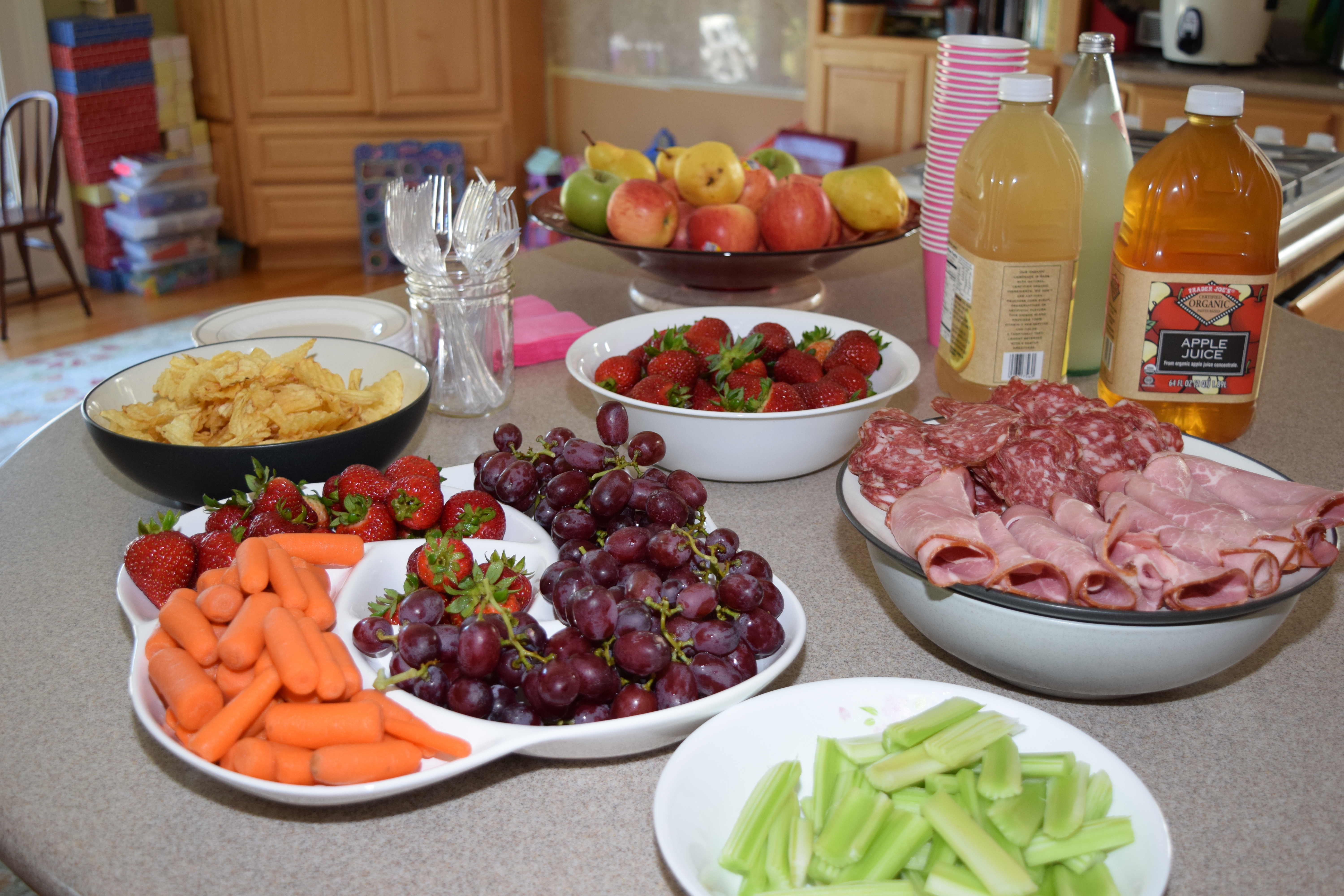 We stopped for a brief snack at this time. Most kids were thirsty after the bread and butter, and we had snacks out that people could munch on as they wished. For the ham and salami, I was thinking about getting a chilled dish like this, but I realized that a bowl filled with ice and a plate on top would work too!