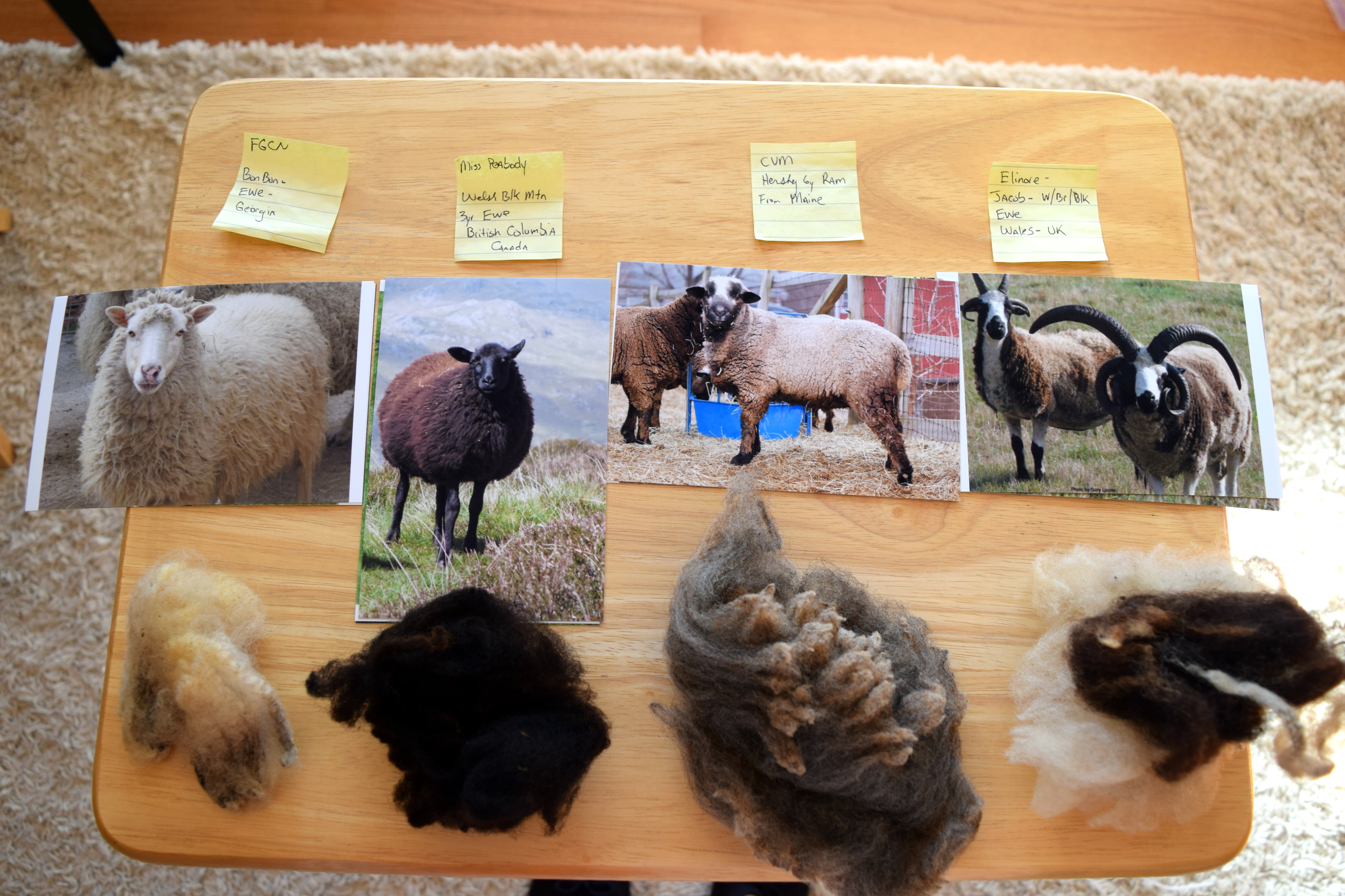 Then I passed around samples of raw wool from four different breeds of sheep along with a corresponding picture. I got the raw wool samples from Ared2Die4 on Etsy and they were inexpensive and fun to show to the kids. I warned the kids that raw wool is dirty and that we would wash our hands after touching the samples.