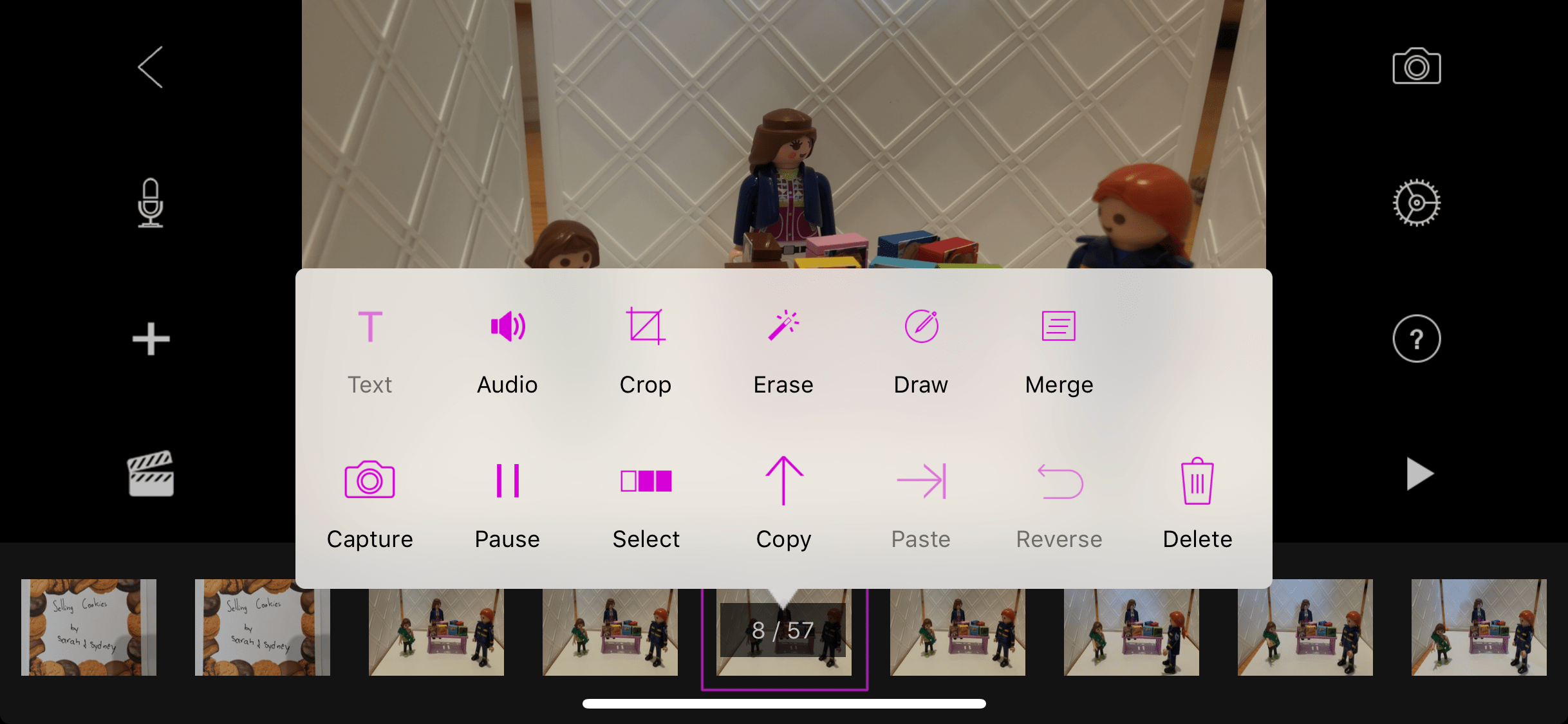 Using Crop, Erase, Draw and Merge all require in-app purchases, but the rest are all available in the free version. It is useful to copy photos if you need to make part of your movie longer and that part of the scene does not have much movement, such as when the characters are just talking to each other. After you tap on Copy, you would scroll your purple box to where you want to paste the photo. Tap the purple box and then tap Paste. The photo will be copied right before your current spot in your movie.