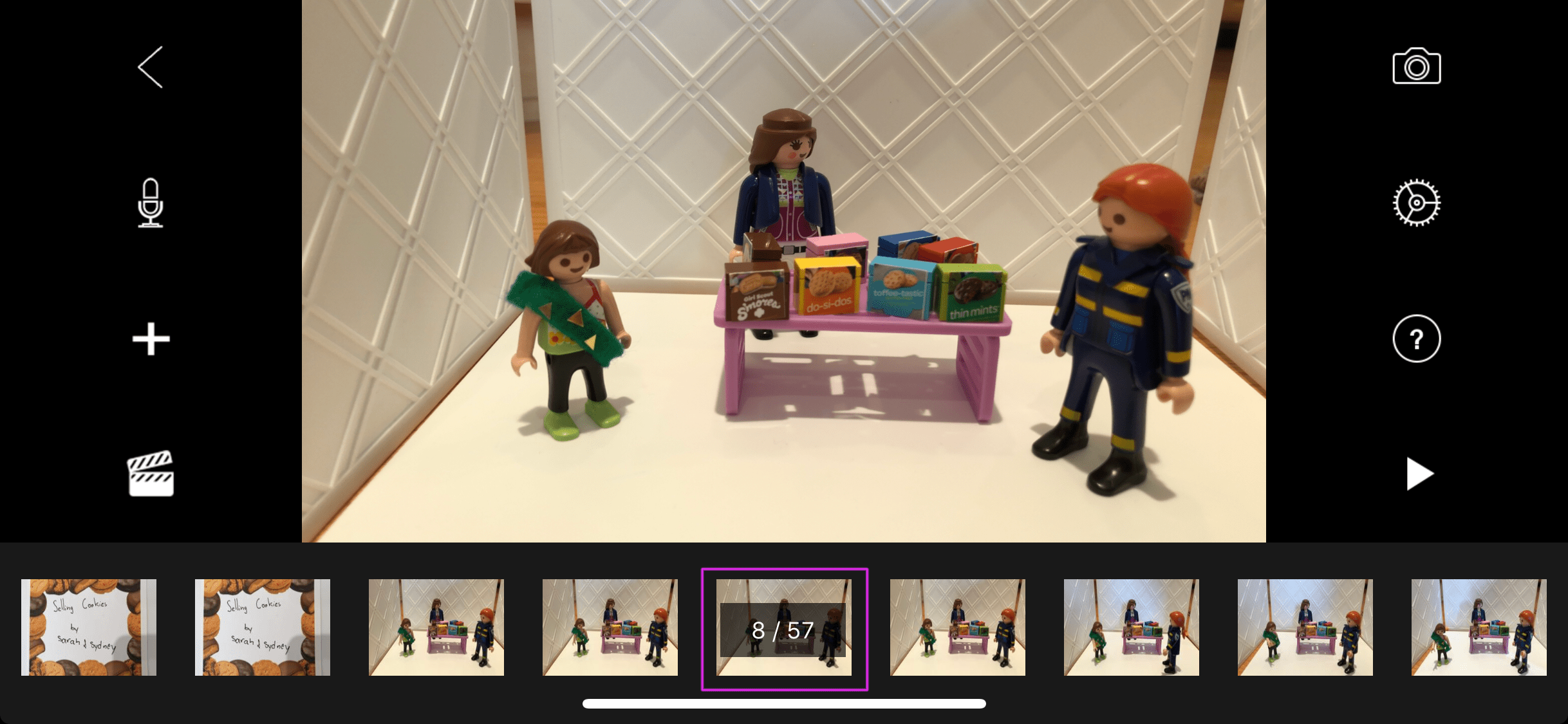 They set up their scene and took their photos. We used double-stick tape when a character needed to hold a cookie box. Then they recorded their dialogue. We were a bit pressed for time since we had quite a bit of other cookie business to take care of at the same meeting. They each had about 30 minutes to create their movie. It would have been better if they had 45 minutes to give them time to refine their movie. But 30 minutes was long enough to give them the experience, even if the end product was not their best work.