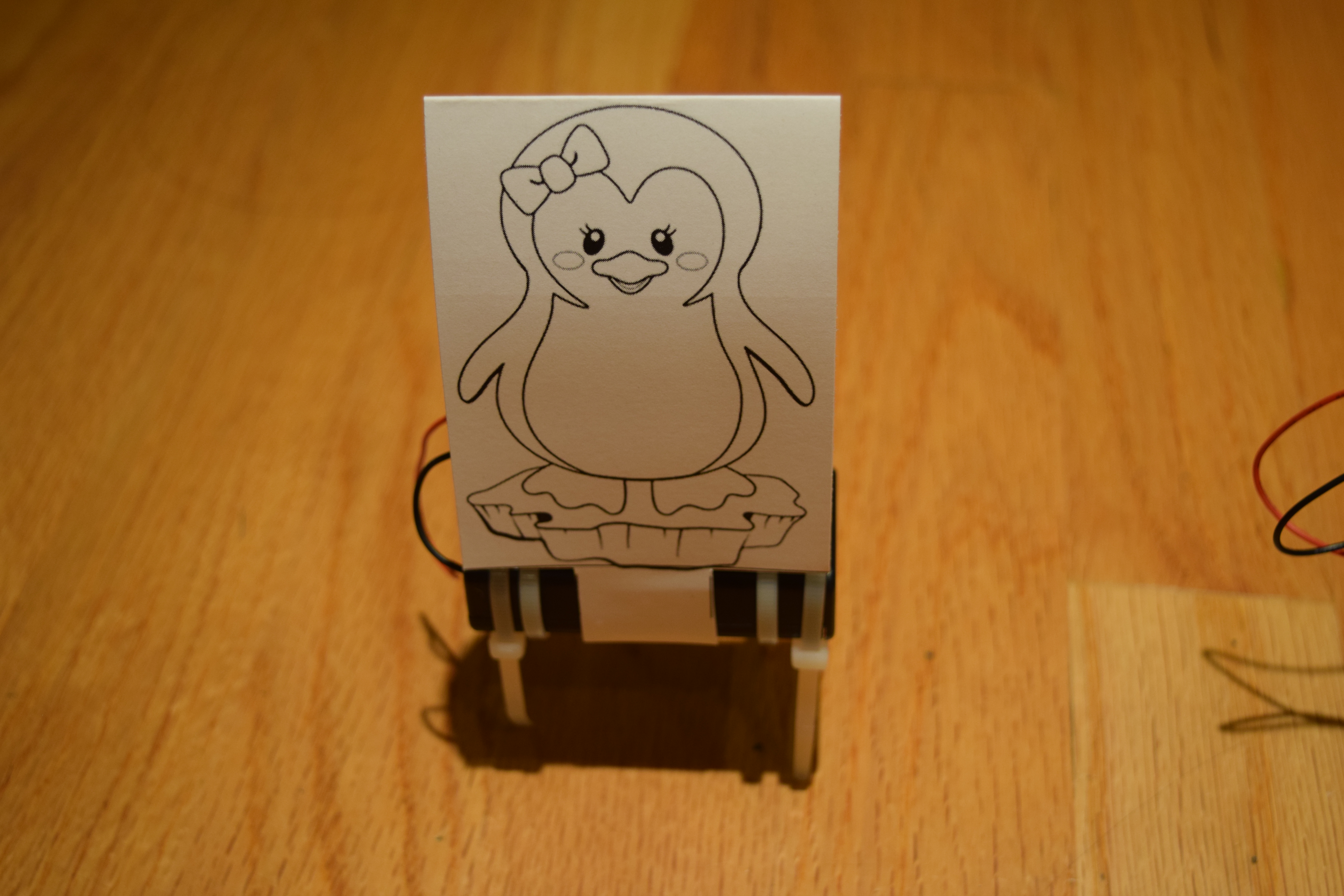 Here is the file with the penguin robot that we let the kids color to decorate their penguins. After they colored them in, just tape it on. Make sure the paper is not bumping against the motor to reduce the noise.