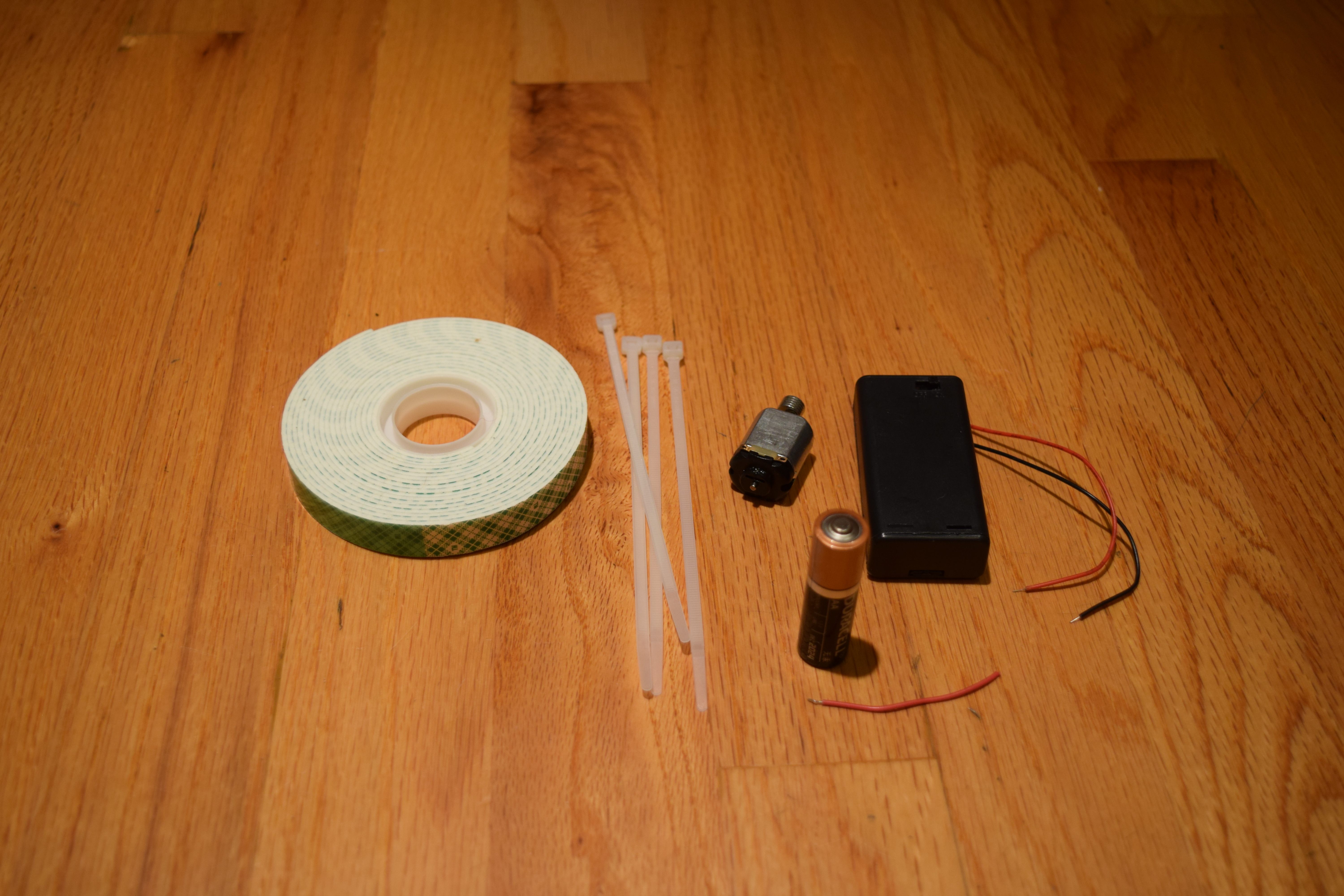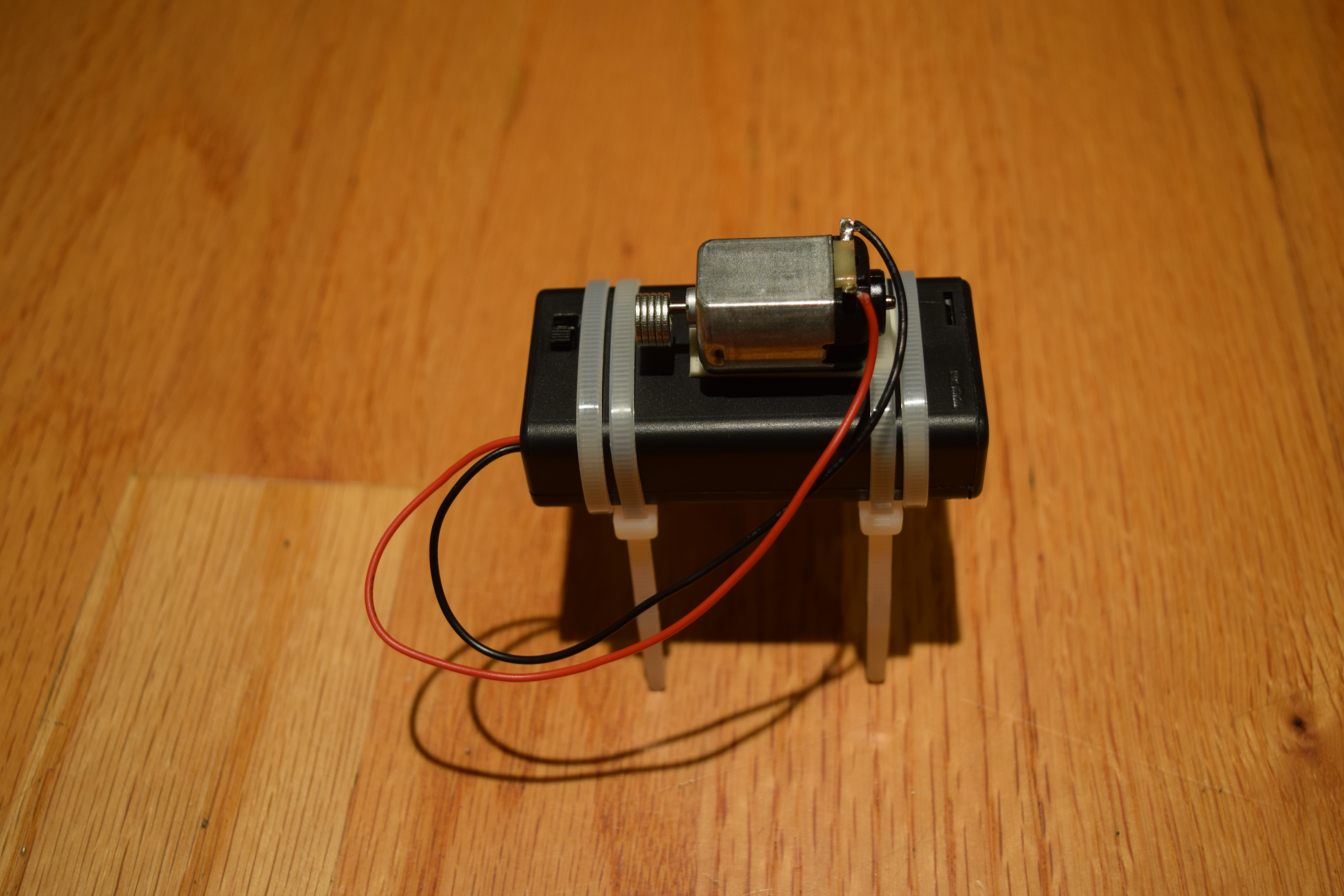 Use the double-stick foam tape to attach the motor to the battery pack. Attach the four cable ties so the tips point down and they look like legs.