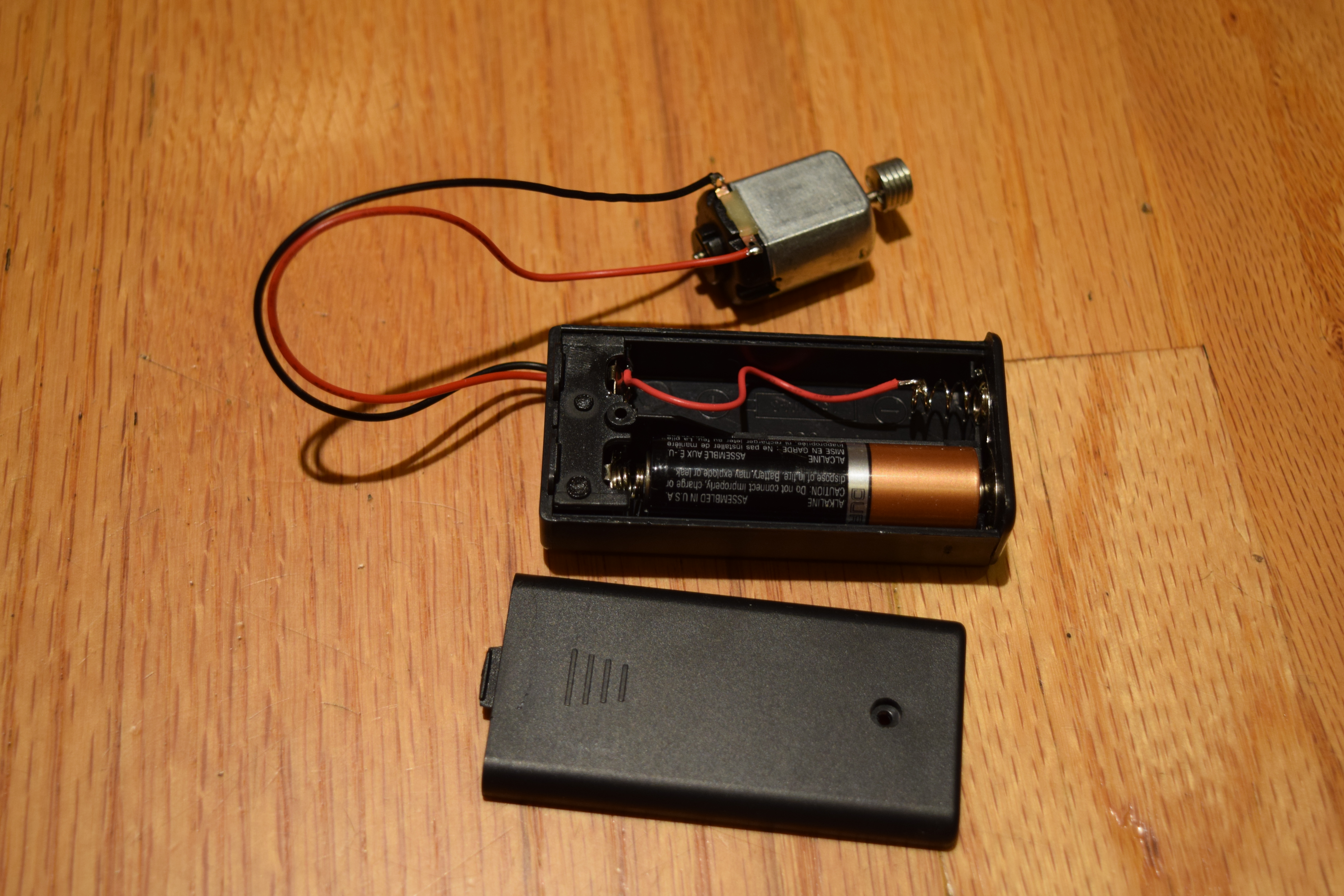 Solder the leads of the battery holder to the motor. I chose to use only one AA battery per robot. It works fine with two batteries, but the vibration makes a louder sound, and it was not conducive to a festive party atmosphere. Shorting out one side of the battery holder with a wire that I soldered allowed me to use just one battery and reduce the noise a bit.
